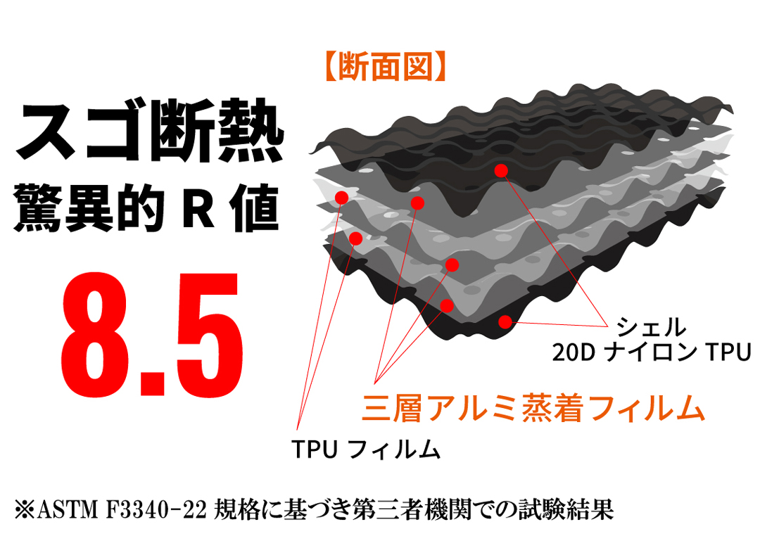 このようにR8.5という高断熱性能は、氷点下を下回るような環境や雪中キャンプなど、厳しい自然条件下でも安心して使用できるスペックを備えている証拠になります。