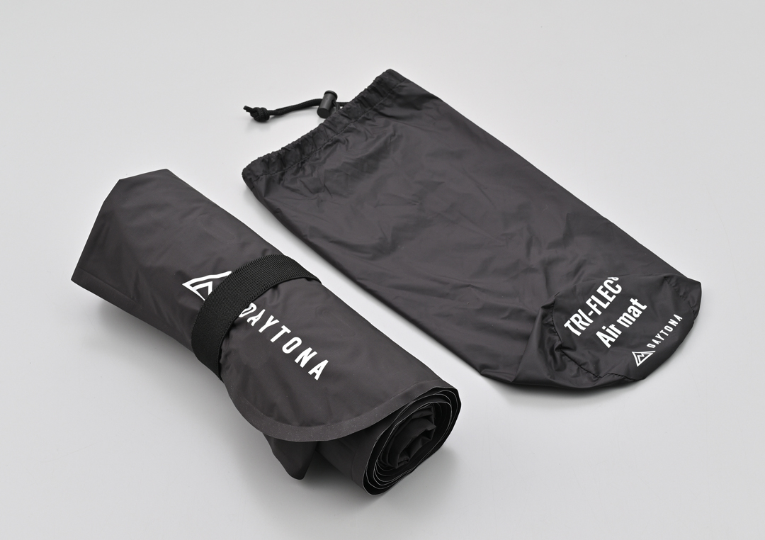 大きさと厚みに加えて、収納性もキャンプ道具を選ぶうえでの重要な要素です。トリフレクエイトエアマットは、その点においても妥協はありません。収納時には、直径わずかφ11cm × 長さ33cmというコンパクトサイズに収まり重量も約1.0kgと軽量です。荷物の制限があるバイクツーリングでも持ち運びしやすくなっています。