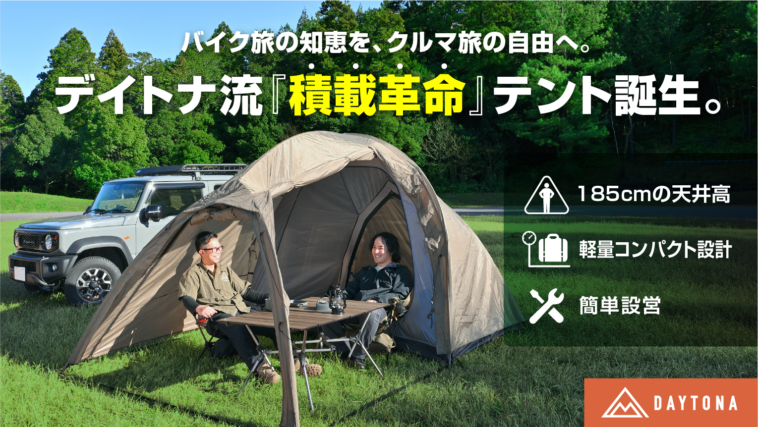本製品は、バイクキャンプで磨き上げてきた軽量・コンパクト設計と設営のしやすさをそのままに、ジムニーなど積載量の限られた車でのキャンプでも快適に使える高天井と居住性を追求したドーム型2ルームテントです。